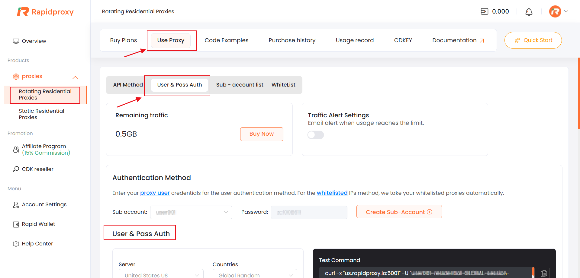 This section allows you to configure residential proxy parameters and generate proxy credentials based on [sub-accounts](https://docs.rapidproxy.io/proxies/dynamic-residential-proxy/get-proxy/user-and-pass-auth/creating-sub-account).