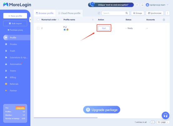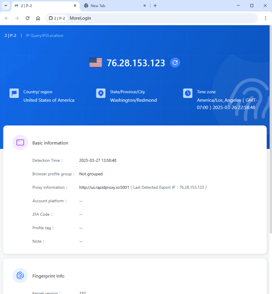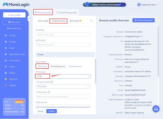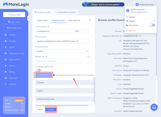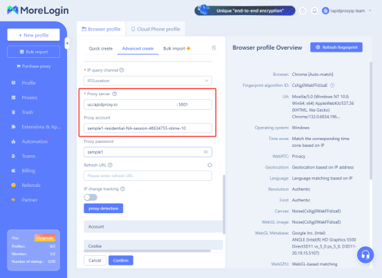 将从 Rapidproxy 生成的代理信息粘贴到 MoreLogin 的相应字段中。