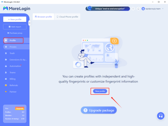* 在新配置文件中，点击 **【Browser profile/浏览器配置文件】**，选择 **【Advanced create/高级创建】**，然后点&#x51FB;**【New proxy/新建代理】**。