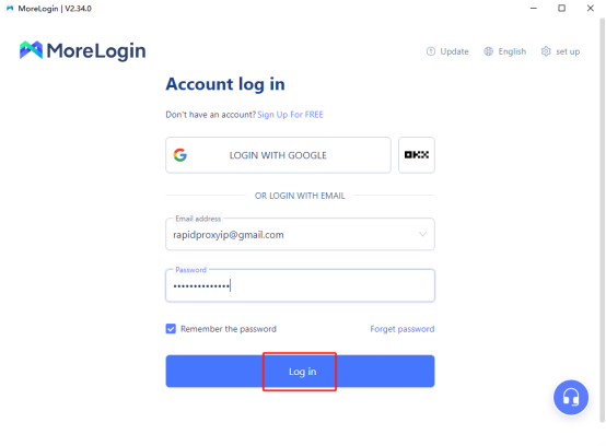 打开 MoreLogin 浏览器，点击 **【Log in/登录】** 以访问你的账户。