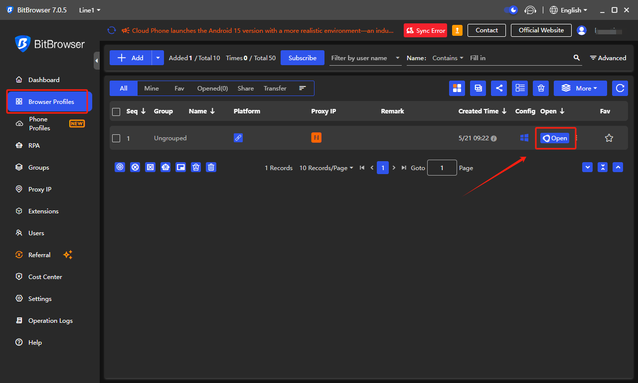 找到您刚刚创建的配置文件，点&#x51FB;**【Open/打开】**，启动带有已配置代理的浏览器环境。